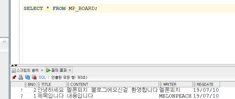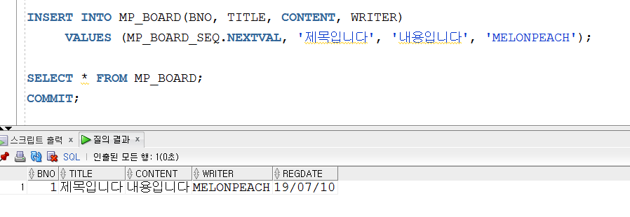 VALUES (MP_BOARD_SEQ.NEXTVAL, '제목입니다', '내용입니다', 'MELONPEACH');