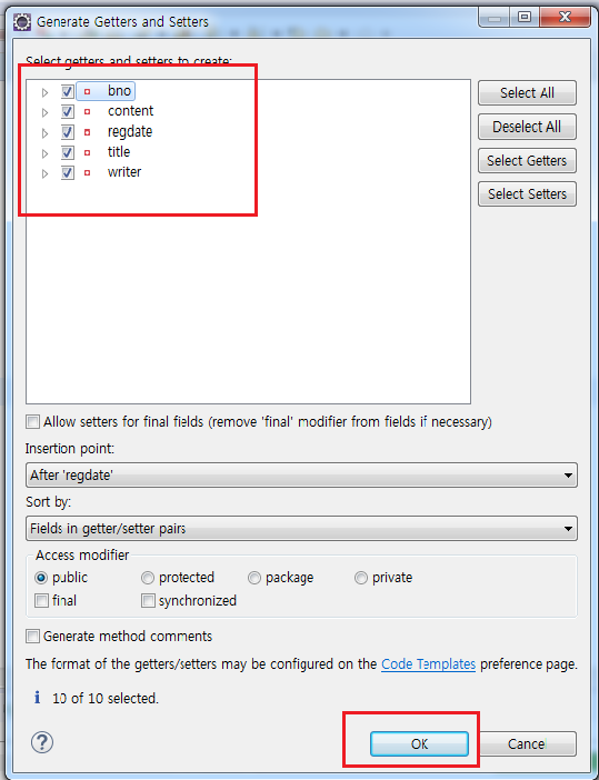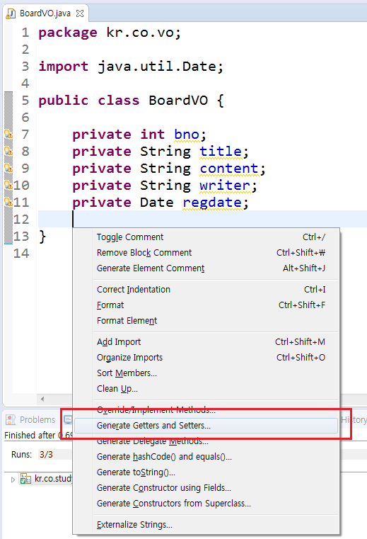 그리고 BoardVO안쪽 아래에 Alt + Shift + s를 누르거나 오른쪽 버튼 > Source에