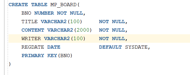 REGDATE : 등록일.. PRIMARY KEY(BNO)를 기본키라고하는데 기본키를 BNO로 하겠다는 말입니다.