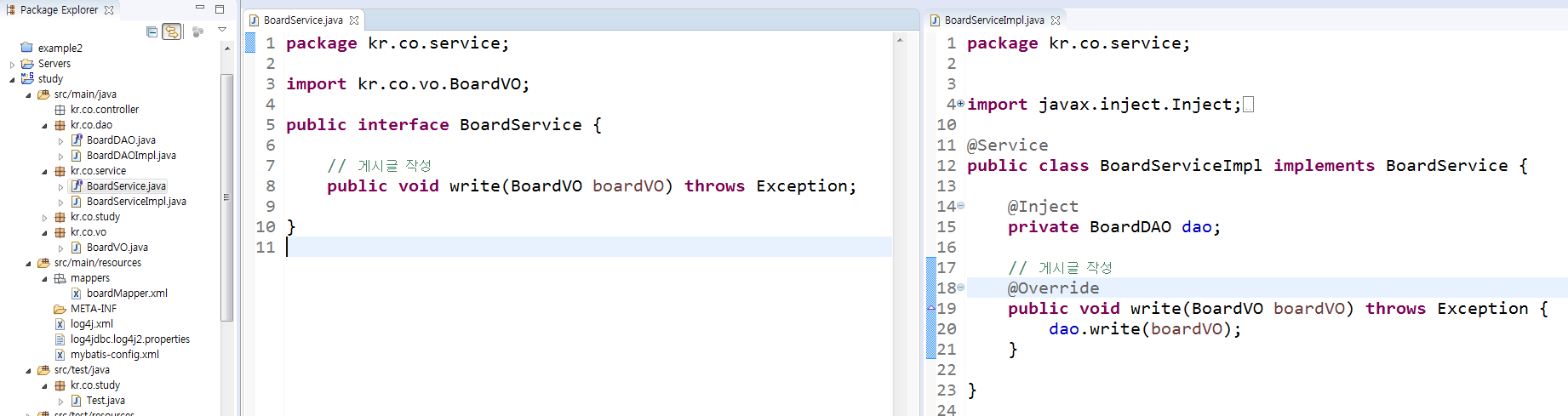 kr.co.service에 BoardService와 BoardServiceImple을 만들어서 코드를 작성해 줍니다.