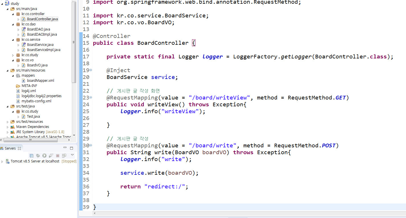 kr.co.controller에 BoardController.java 파일을 만들고 코드를 작성해 줍니다.