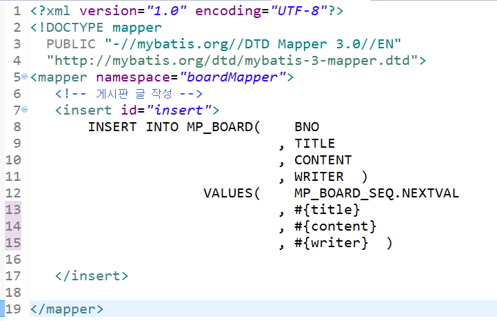 src/main/resources/mappers에 boardMapper.xml에 들어가서 코드를 작성해줍니다.