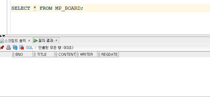 테이블만 만들었지 데이터는 넣어주지 않았기때문에 조회를하면 데이터가 없다는걸 알 수 있습니다.