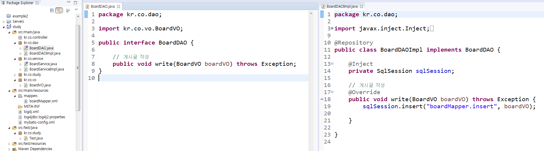 kr.co.dao에 BoardDAO와 BoardDAOImpl을 만들어서 코드를 작성해 줍니다.