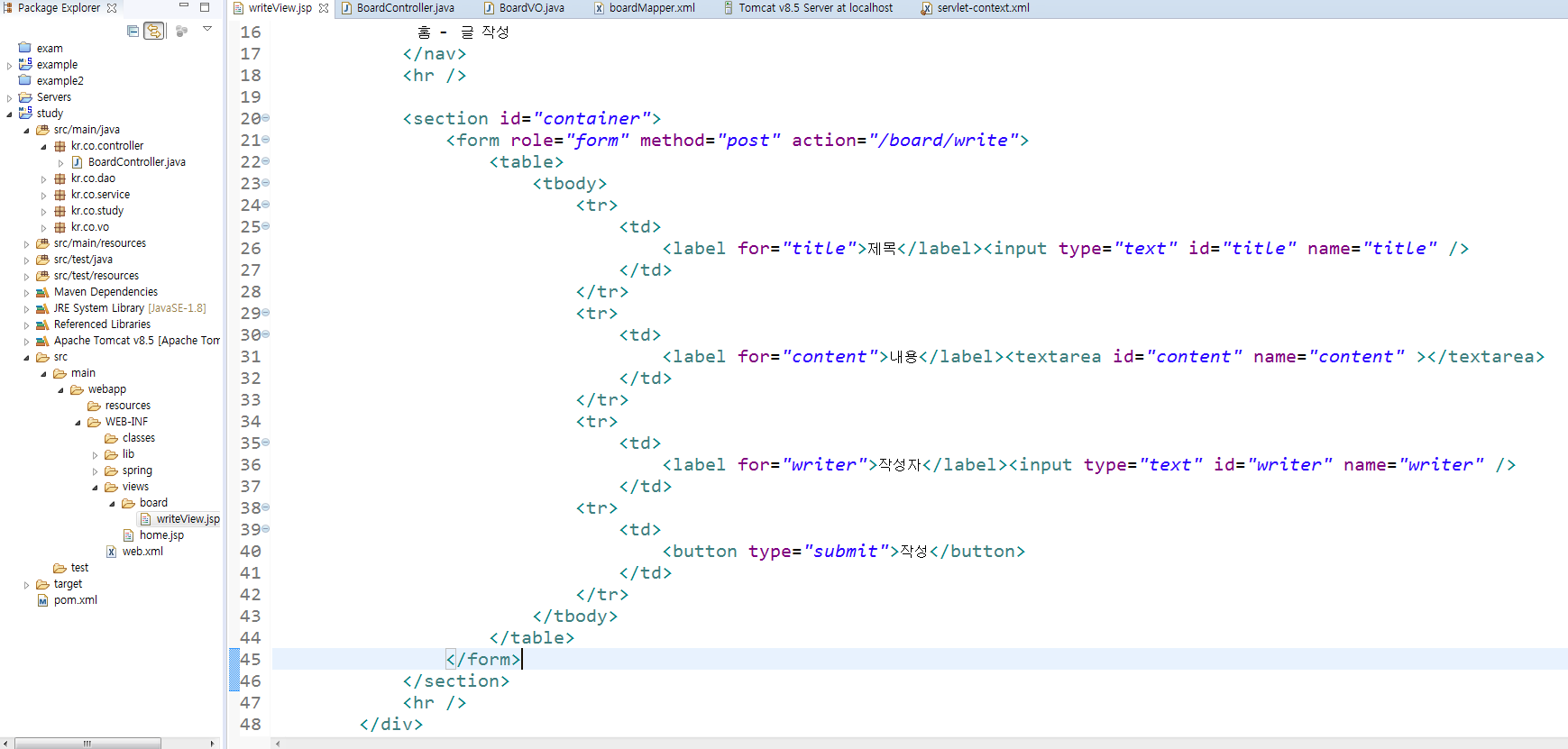 src/main/webapp/WEB-INF/views에 board 폴더를 만들고 writeView.jsp파일을 생성하여 코드를 추가해줍니다.
