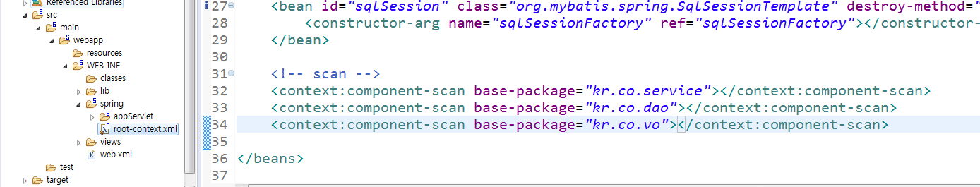 이제 스프링이 스캔 할수 있도록 root-context.xml파일에 코드를 추가해줍니다.