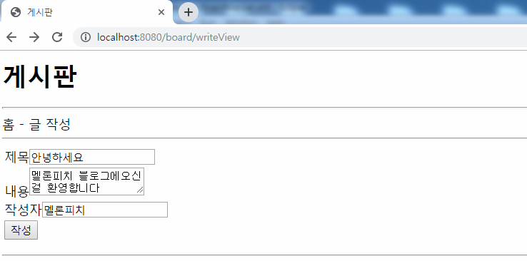 제목과 내용, 작성자를 입력한후 작성 버튼을 누릅니다.