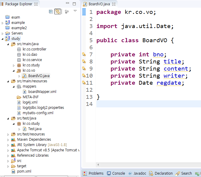 kr.co.vo에 BoardVO.java 파일을 만들어주고 그림과 같이 코드를 작성해 줍니다.